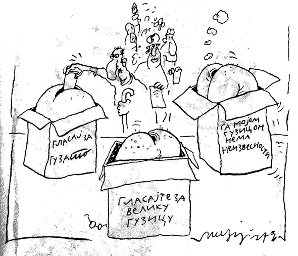 Zajebanciju na stranu, „ubi nas ta jev­ti­na zabava“, teorija veli da je mala iz­laznost Njihova prednost i Nji­ho­va pobeda, zato začepi nos i glasaj, što se kaže, makar za „crnog Ciganina“, a može i za „Lepog Boru“. Kažu da ni u jednoj demok­ra­tiji ne postoje „laboratorijski uslovi“, nar­očito ne u našoj. I još vele, evo N­ad­ež­de Milenković, da demokratiju mnogo vi­še ugrožava naša nezainteresovanost, ne­go nečije zloupotrebe. Uostalom, nije Bo­sna preko sveta, a tamo vele „Kad sam gla­dan nisam svoj“! I još vele – „Po­li­ti­čari idite svi u pičku materinu“! Ali da­le­ko je teorija, ovde se praksa nogama vr­ši braćo i gospođe, tako da je, bojim, jedino izvesno da će, kao što reče jedan af­or­i­s­tičar, „Izlaznost biti ogromna – iz ze­m­lje“.