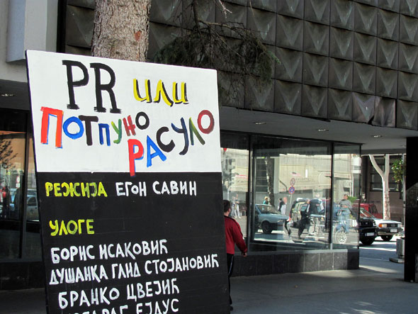 Za kraj, početak, bilo šta, da se kaže da u Valjevu bilo pozorište iz Beograda. Predstava „Totalno rasulo” Nebojše Romčevića u režiji Egona Savina. Komedija, a kako ćeš drugačije, o tome dokle su nas dovele Ovakve partije. Sala Doma kulture bila skoro puna, a publika, pozorišna. Pozorišna na Novi način. Publika je bila tako pozorišna da se ponašala totalno Kursadžijski, ulazilo se na pola predstave, ne da se kikotalo i na nagoveštaj kakve scenske prostote, nego se to razobadavalo sve u šesnes’. Došlo dotle da nije problem samo što nema posla, tog ‘leba, došlo bre dotle da ne znamo ni da se ponašamo. Dođe mu da je izlaz iz svega samica, za svakoga normalnog. Ako je i toga ostalo.
