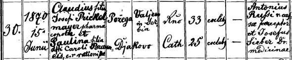 Tako je u Đakovu, koje inače nije bilo Prikelmajerovo rodno mesto (rođen u Požegi), Klaudijeva ličnost ostala iza neprozirnih velova protoka vremena. I tako je ostalo sve do skora, kada je gospodin Lekšić, čudnim putevima, ne iz Đakova ili Zagreba, već sa druge strane Antlantika, iz Kalifornijskog centra za izučavanje rodoslovlja, dobio digitalizovane Matične knjige venčanih u Đakovu, za period 1856–1900. U odeljku za 1870. godinu piše da su se 15. juna u Đakovu venčali Klaudio Prikelmajer, farmaceut, rođen u Požegi, a sa mestom boravka u Valjevu, u Srbiji (33 godine) i Paulina, ćerka pokojnog Karla–Dragutina Brauneisa, visokog vojnog službenika, rođena u Đakovu, sa boravištem u Đakovu (25 godina), a da su im kumovi bili službenik Antun Rusi i lekar Josip Siber.