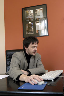 (Foto: Miroslav Jeremić) U maloj, diskretno dizajniranoj kancelariji GATE, na zidovima, na nekoliko fotografija prepoznajemo najefektnije detalje već useljenih stambenih zgrada, koje je ova građevinska kompanija podigla. Poodavno su obeležile, kao zaštitni znak, valjevske ulice. Najbolja preporuka firme i tima na koji je Aca Mitrović ponosan. Pokazuje nam tek izašle postere za novu kampanju uređenja fasada grada Valjeva.