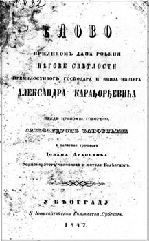 Troškom Jovana Arapovića, „penzioniratog činovnika i žitelja valjevskog”, objavljena je 1847. godine knjiga „Slovo prilikom dana rođenja njegove svetlosti i knjaza našega Aleksandra Karađorđevića”. Taj govor onovremenog valjevskog učitelja Aleksandra Banovića ispunjava svih 15 strana ove nevelike knjige, štampane u Beogradu, u Knjigopečatnji Knjažestva srbskog. Za nas je ona danas zanimljiva i značajna zato što je to prva štampana knjiga koja je u Valjevu nastala i ovde imala i izdavača. Na njenim koricama je zabeleženo i to da je Banović to pohvalno „slovo” u čast ondašnjeg srpskog vladara govorio „pred crkvom”. Svakako pred Valjevskom crkvom.