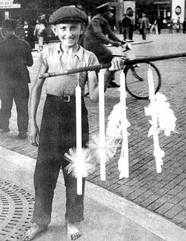 Pogledajte ovu fotografiju, snimljena je 1938. godine u Beogradu: 15-godišnji šegrt Miodrag – Mile Pavlović, bos na sred Terazija reklamira robu svoga gazde.
